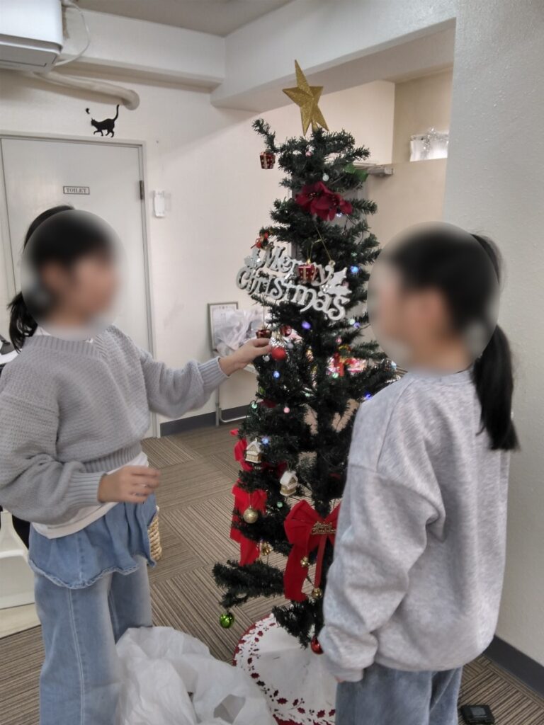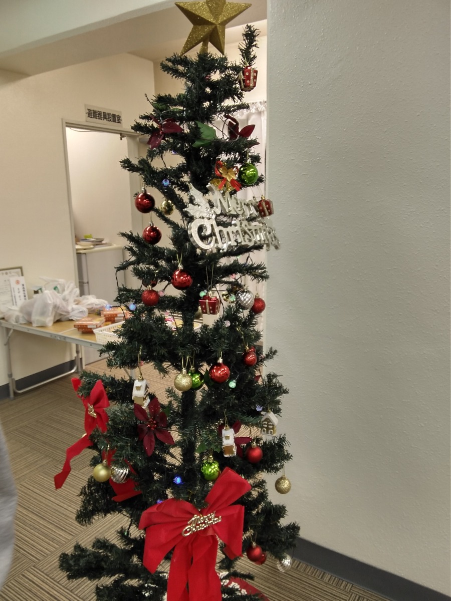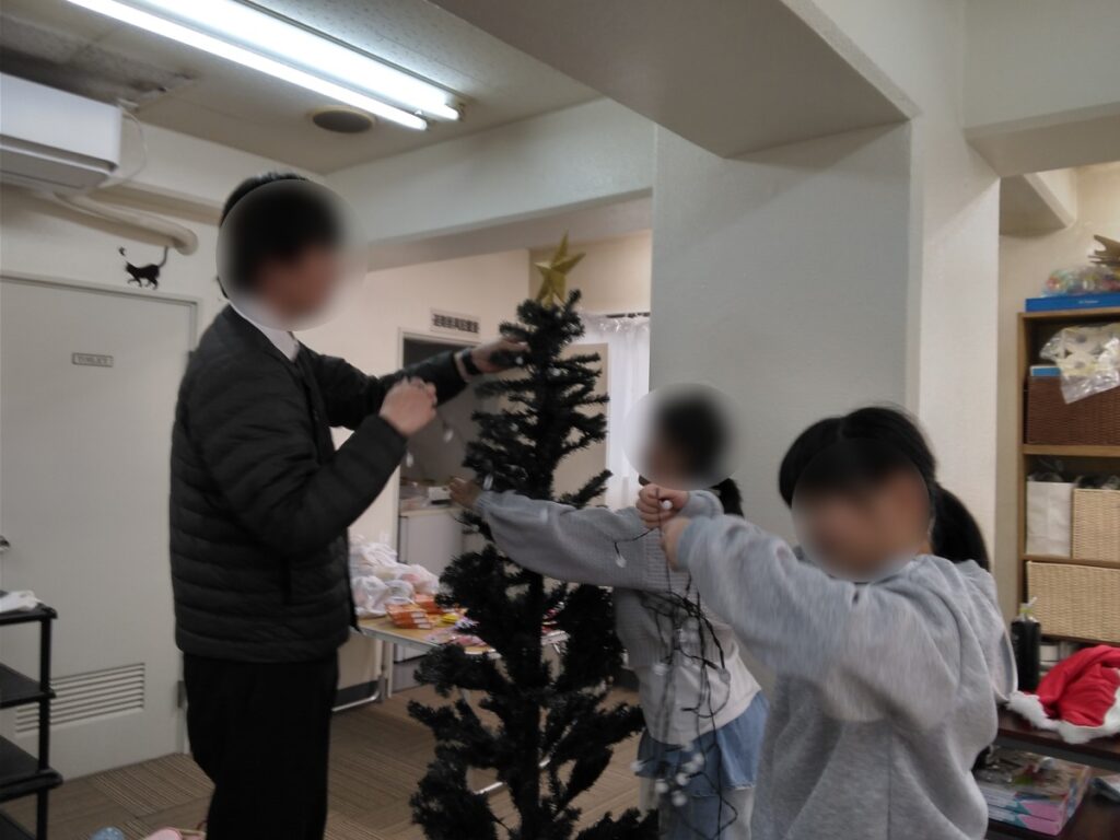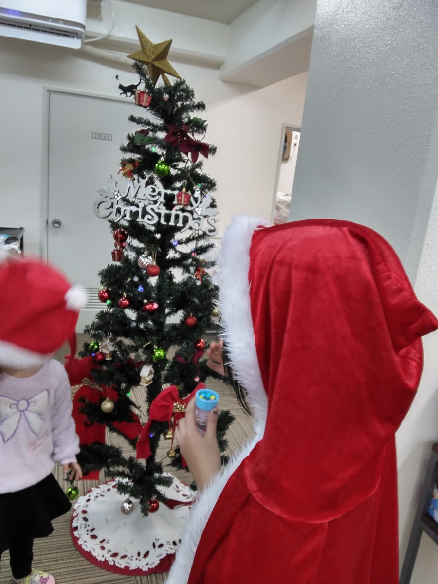 それではボランティアの H さんにクリスマスツリーを、飾ってもらいましょう!!